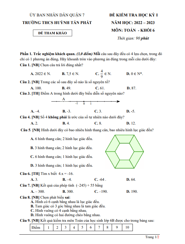 Đề tham khảo học kỳ 1 Toán 6 năm 2022 – 2023 trường THCS Huỳnh Tấn Phát – TP HCM