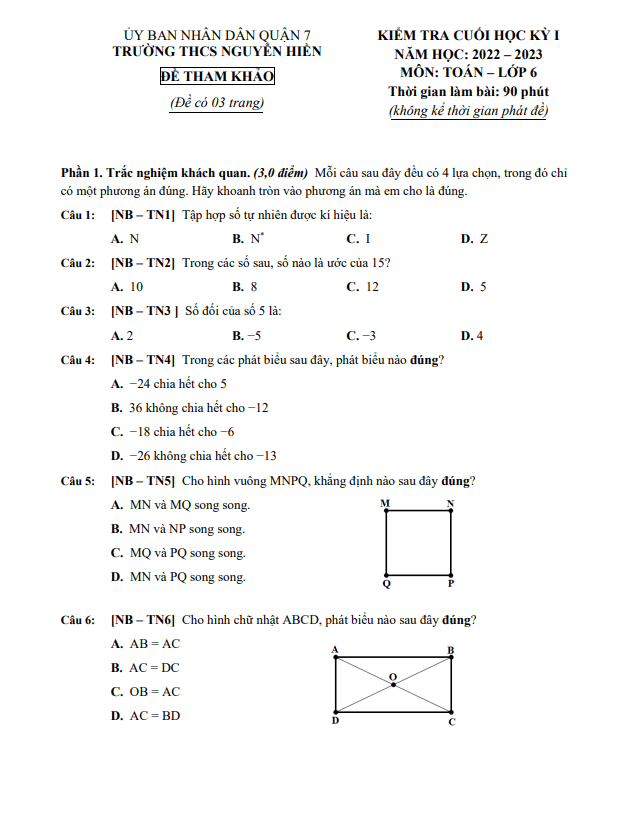 Đề tham khảo học kỳ 1 Toán 6 năm 2022 – 2023 trường THCS Nguyễn Hiền – TP HCM