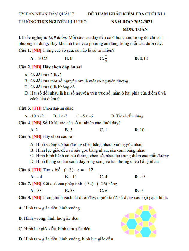 Đề tham khảo học kỳ 1 Toán 6 năm 2022 – 2023 trường THCS Nguyễn Hữu Thọ – TP HCM