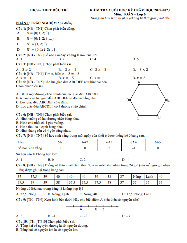 Đề tham khảo học kỳ 1 Toán 6 năm 2022 – 2023 trường THCS – THPT Đức Trí – TP HCM