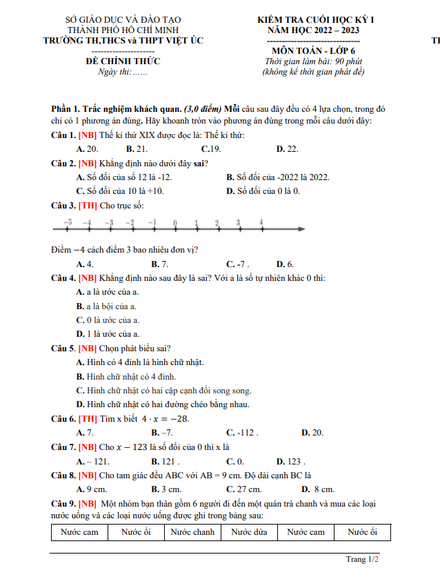 Đề tham khảo học kỳ 1 Toán 6 năm 2022 – 2023 trường Việt Úc – TP HCM