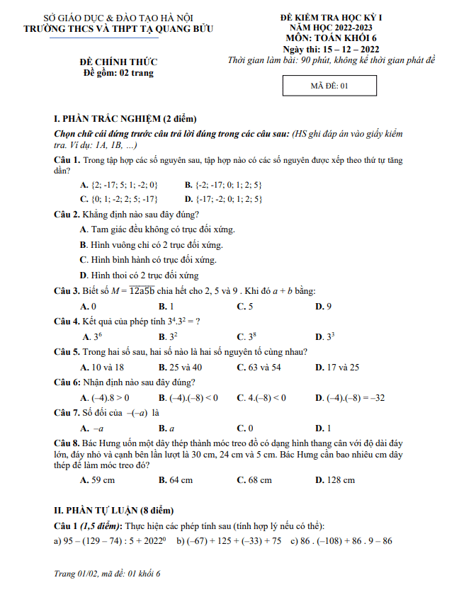 Đề học kỳ 1 Toán 6 năm 2022 – 2023 trường Tạ Quang Bửu – Hà Nội