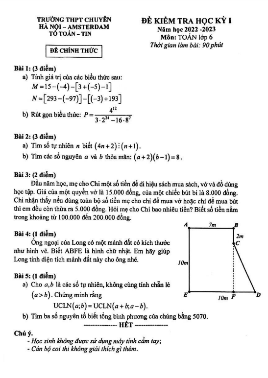Đề thi học kỳ 1 Toán 6 năm 2022 – 2023 trường THPT chuyên Hà Nội – Amsterdam