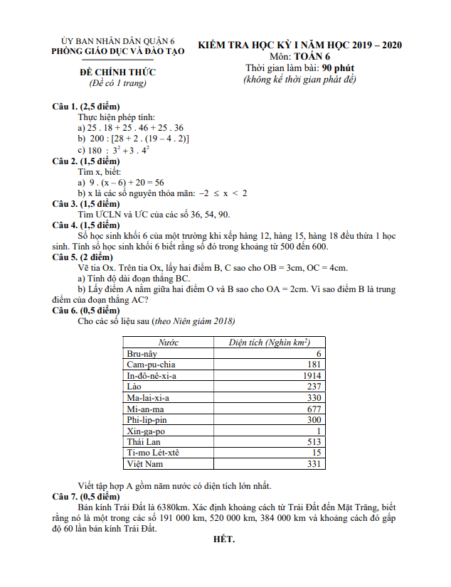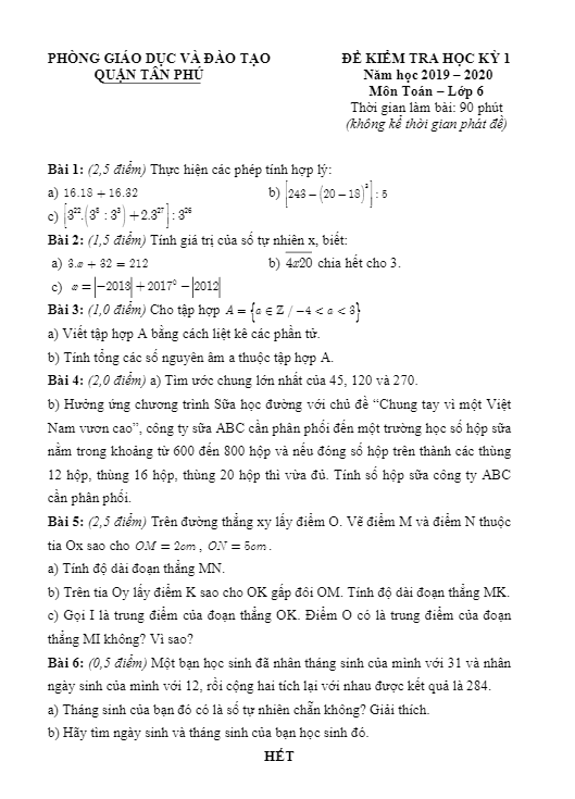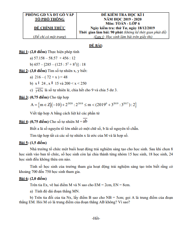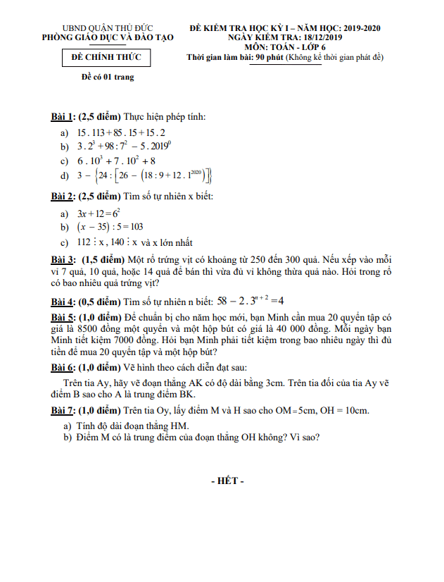 Tổng hợp ĐỀ THI HK1 TOÁN 6 có đáp án và lời giải chi tiết của các trường Trung học Cơ sở, các Phòng Giáo dục và Đào tạo, các Sở Giáo dục và Đào tạo trên toàn quốc (File PDF). Các ĐỀ THI HK1 TOÁN 6 mới nhất sẽ được cập nhật liên tục và nhanh nhất có thể sau khi kỳ thi diễn ra, đáp án và lời giải chi tiết cũng sẽ được TOANMATH.com cập nhật sau đó nhằm giúp bạn đọc thuận tiện trong việc tra cứu và đối chiếu đáp án.