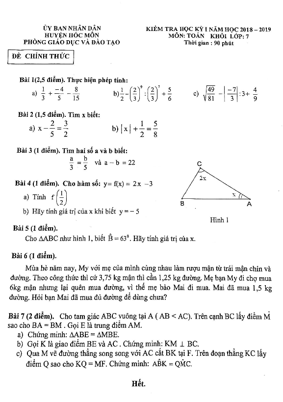 Đề kiểm tra học kỳ 1 Toán 7 năm 2018 – 2019 phòng GD và ĐT Hóc Môn – TP. HCM