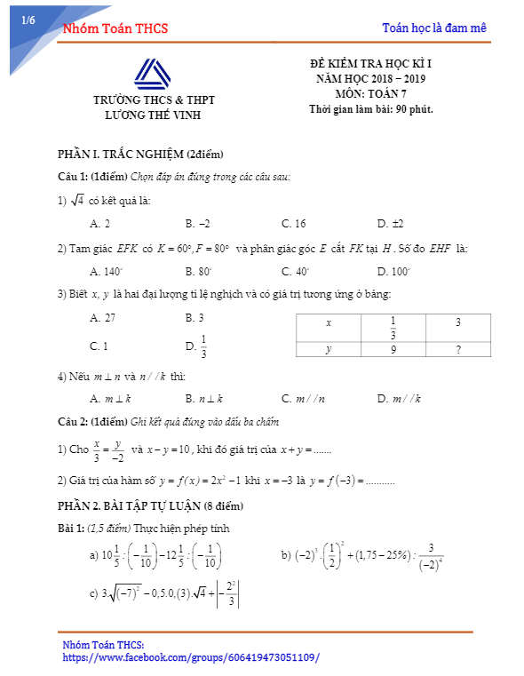 Đề kiểm tra học kỳ 1 Toán 7 năm học 2018 – 2019 trường Lương Thế Vinh – Hà Nội