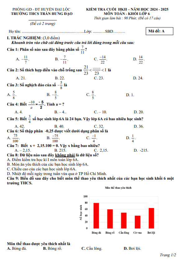 File WORD các ĐỀ THI CUỐI HỌC KÌ 2 TOÁN 6 (nếu có) được đính kèm trong nội dung bài viết, nhằm giúp quý thầy, cô giáo có thể tải xuống miễn phí, phục vụ cho quá trình biên soạn và giảng dạy. Quý thầy, cô giáo và bạn đọc có thể chia sẻ thêm ĐỀ THI CUỐI HỌC KÌ 2 TOÁN 6 bằng cách gửi về địa chỉ email: toanmath.com@gmail.com, nhằm tạo nguồn đề thi phong phú, đa dạng để các em học sinh lớp 6 tham khảo và rèn luyện.