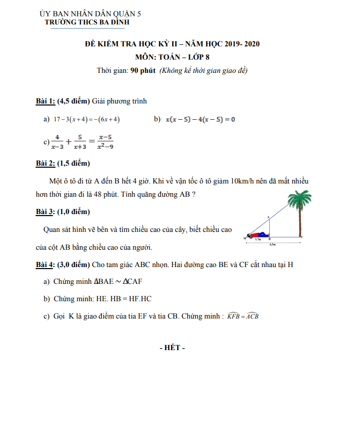 Đề thi HK2 Toán 8 năm 2019 – 2020 trường THCS Ba Đình – TP HCM