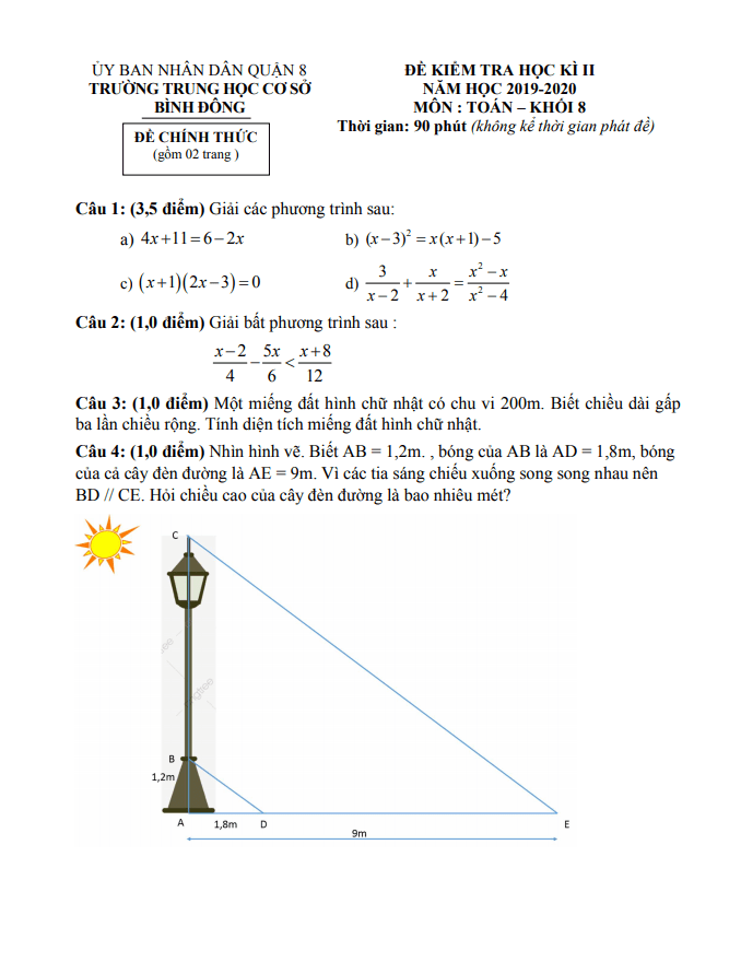Đề thi HK2 Toán 8 năm 2019 – 2020 trường THCS Bình Đông – TP HCM