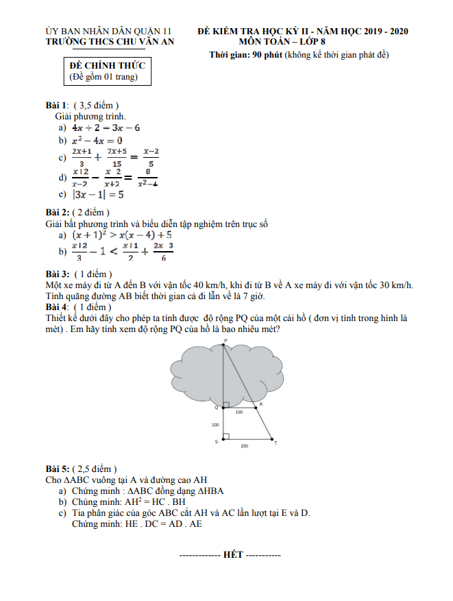 Đề thi HK2 Toán 8 năm 2019 – 2020 trường THCS Chu Văn An – TP HCM