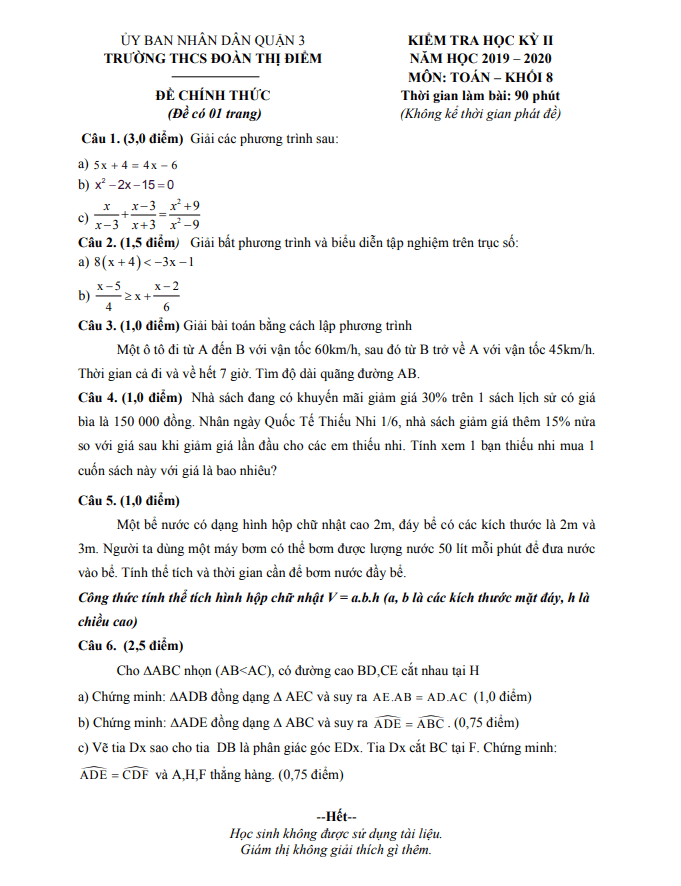 Đề thi HK2 Toán 8 năm 2019 – 2020 trường THCS Đoàn Thị Điểm – TP HCM