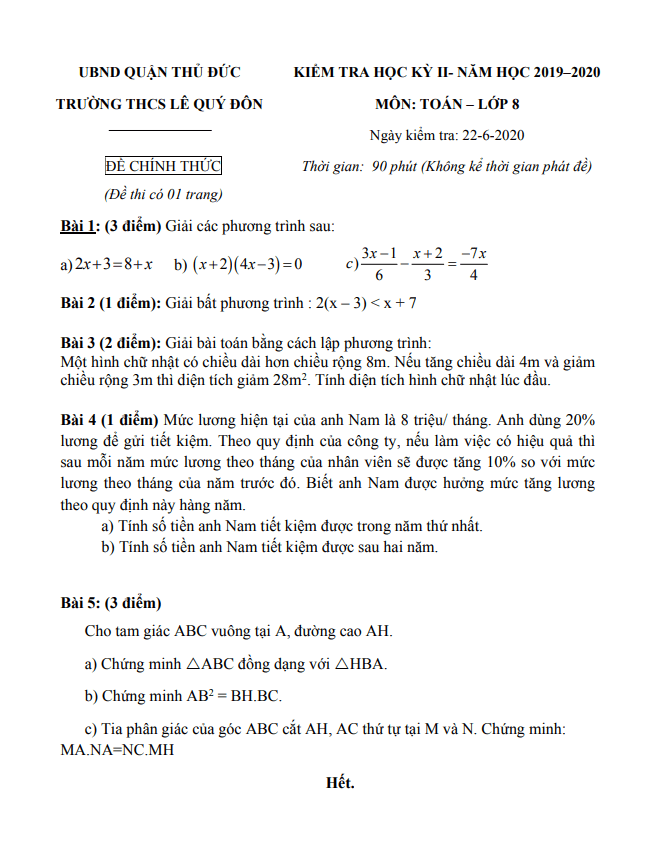 Đề thi HK2 Toán 8 năm 2019 – 2020 trường THCS Lê Quý Đôn – TP HCM