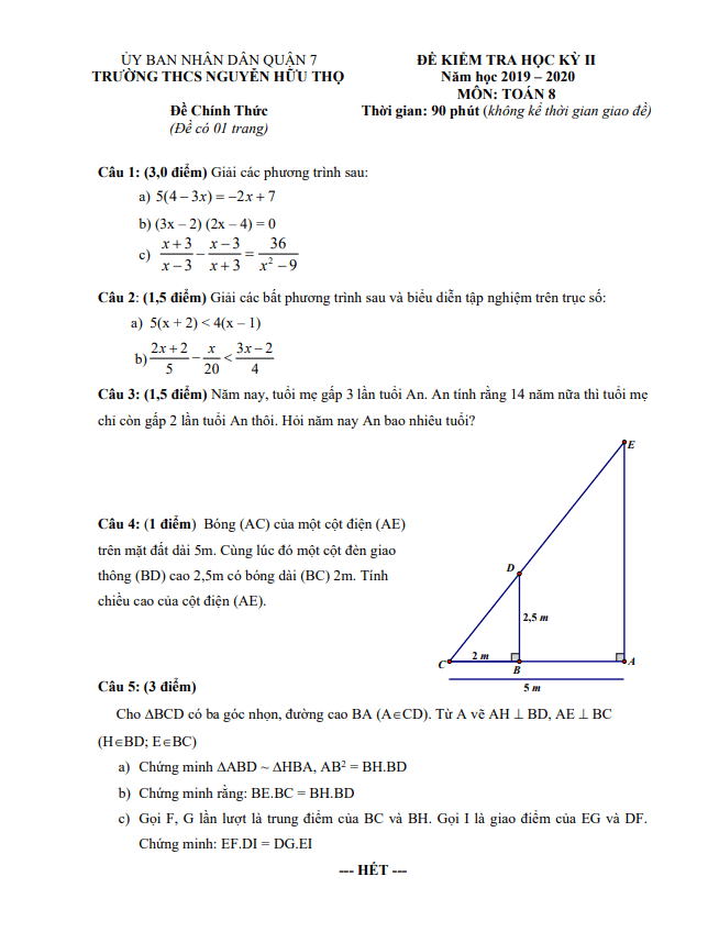 Đề thi HK2 Toán 8 năm 2019 – 2020 trường THCS Nguyễn Hữu Thọ – TP HCM