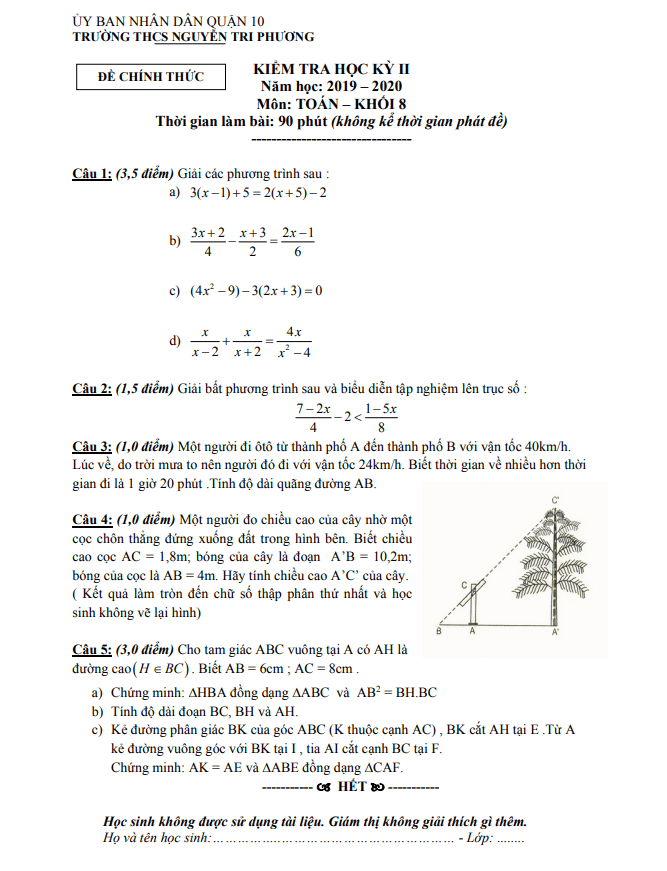 Đề thi HK2 Toán 8 năm 2019 – 2020 trường THCS Nguyễn Tri Phương – TP HCM