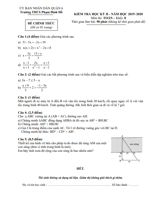 Đề thi HK2 Toán 8 năm 2019 – 2020 trường THCS Phạm Đình Hổ – TP HCM