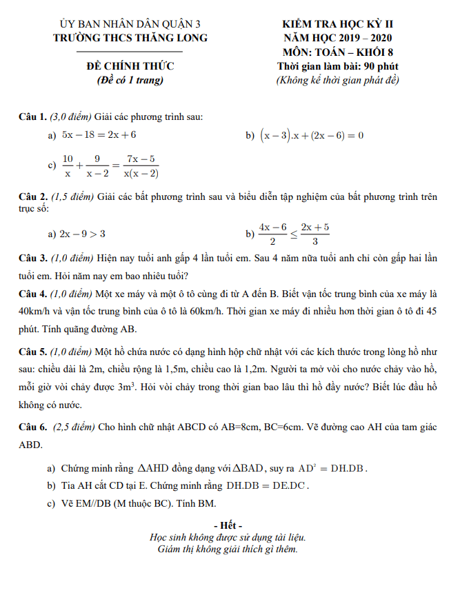 Đề thi HK2 Toán 8 năm 2019 – 2020 trường THCS Thăng Long – TP HCM