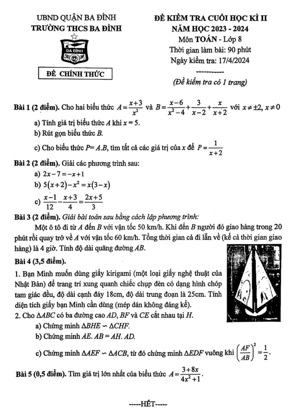 Đề cuối học kì 2 Toán 8 năm 2023 – 2024 trường THCS Ba Đình – Hà Nội