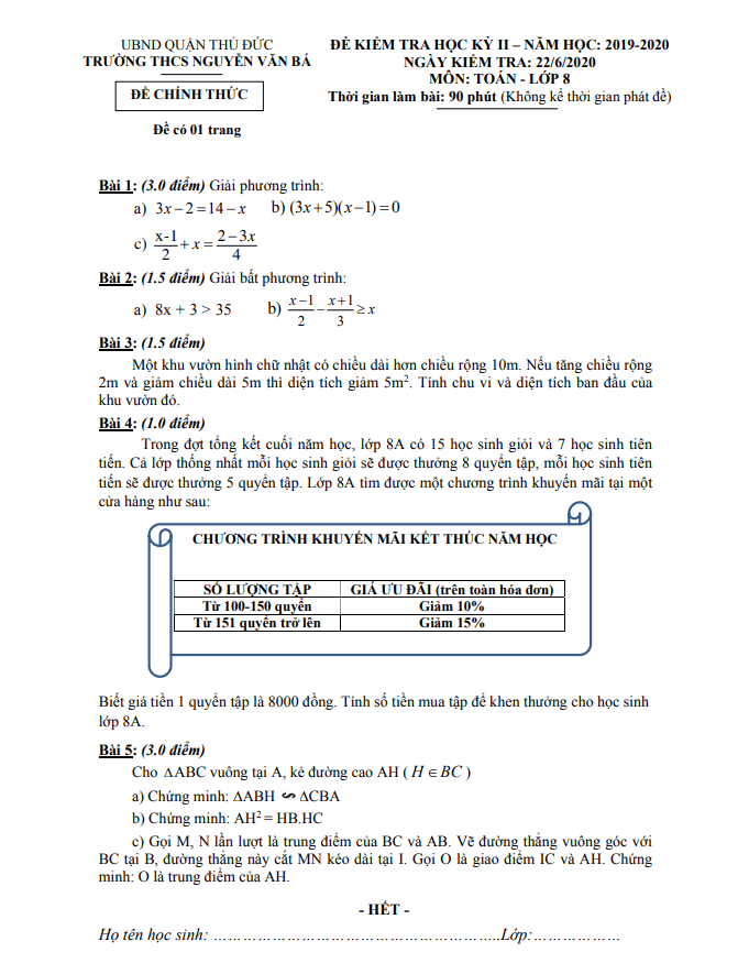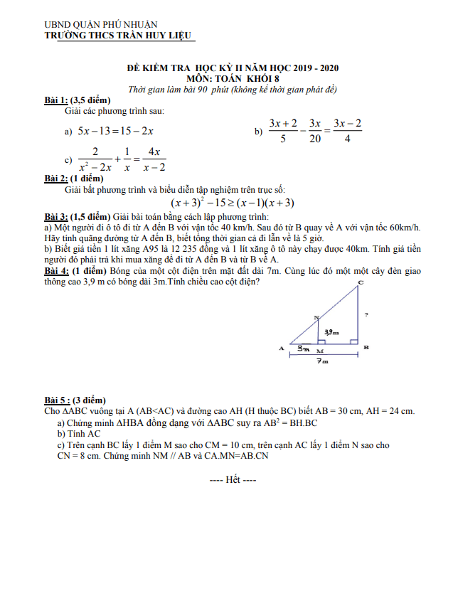 Đề thi HK2 Toán 8 năm 2019 – 2020 trường THCS Nguyễn Văn Bá – TP HCM
