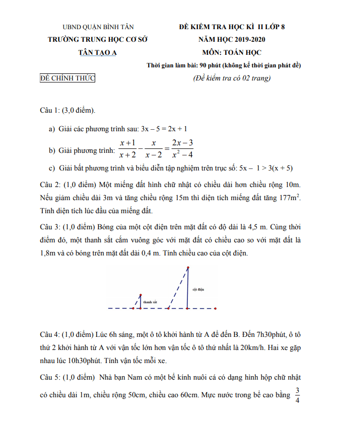 Đề thi HK2 Toán 8 năm 2019 – 2020 trường THCS Tân Tạo A – TP HCM
