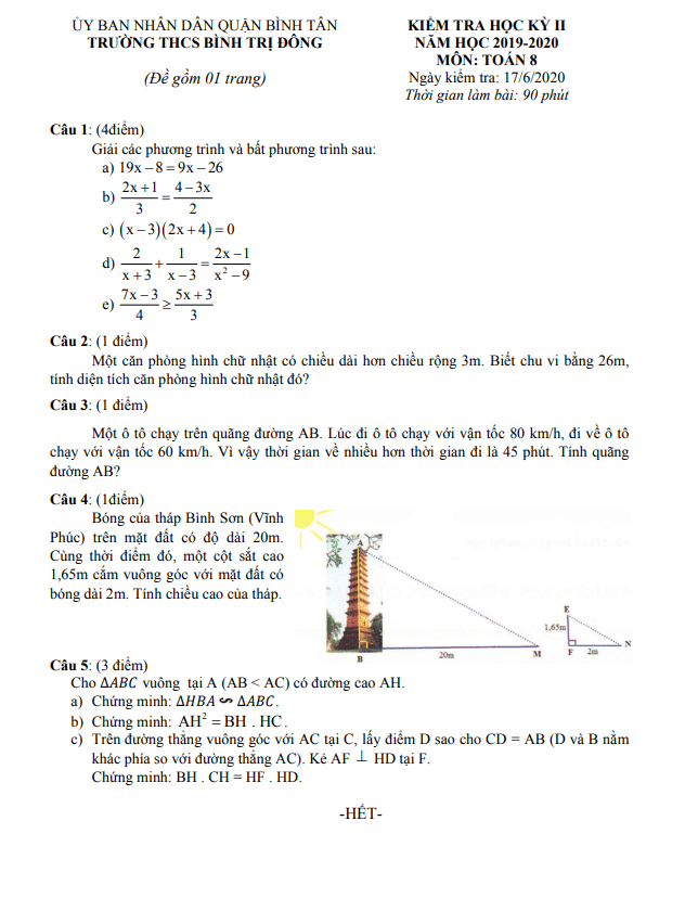 Đề kiểm tra học kì 2 Toán 8 năm 2019 – 2020 trường THCS Bình Trị Đông – TP HCM