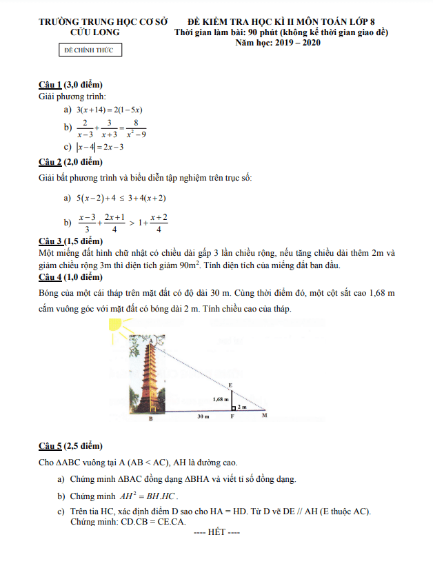Đề kiểm tra học kì 2 Toán 8 năm 2019 – 2020 trường THCS Cửu Long – TP HCM