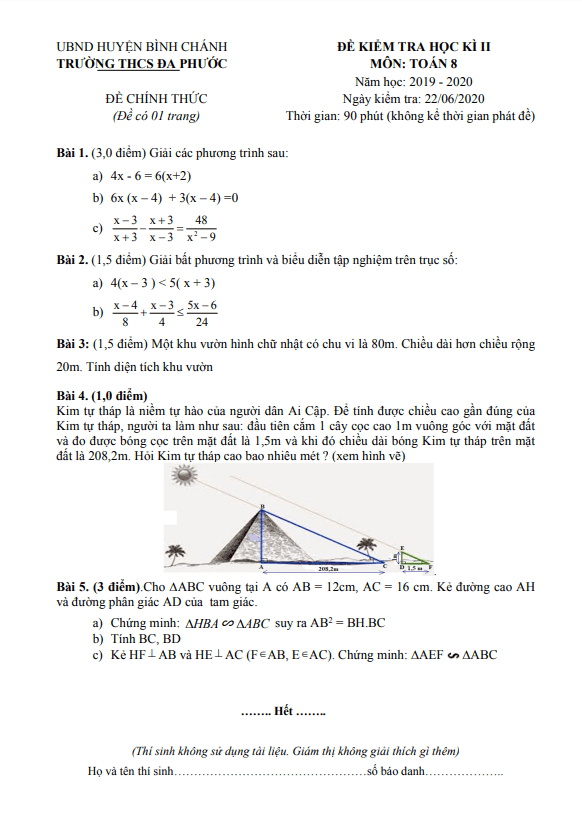 Đề kiểm tra học kì 2 Toán 8 năm 2019 – 2020 trường THCS Đa Phước – TP HCM