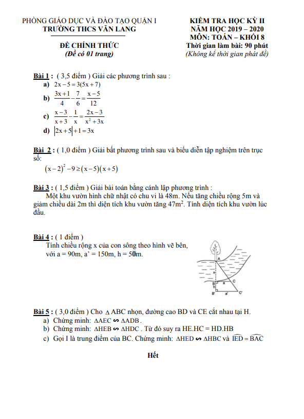 Đề kiểm tra học kì 2 Toán 8 năm 2019 – 2020 trường THCS Văn Lang – TP HCM