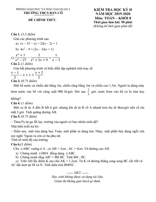 Đề kiểm tra học kỳ 2 Toán 8 năm 2019 – 2020 trường THCS Bàn Cờ – TP HCM