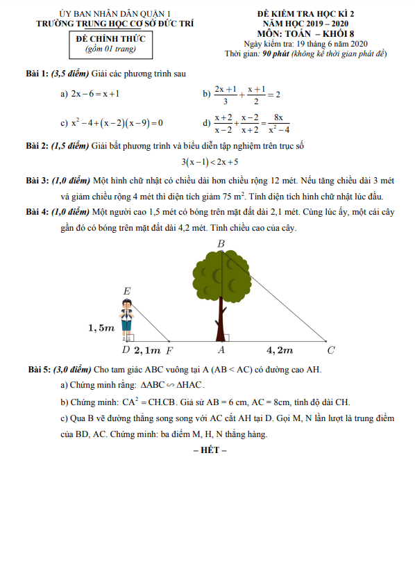 Đề kiểm tra học kỳ 2 Toán 8 năm 2019 – 2020 trường THCS Đức Trí – TP HCM