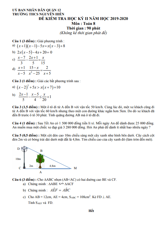 Đề kiểm tra học kỳ 2 Toán 8 năm 2019 – 2020 trường THCS Nguyễn Hiền – TP HCM