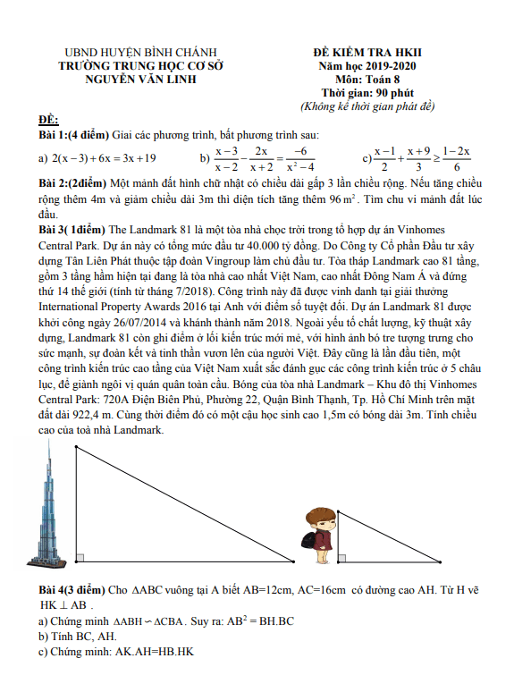 Đề kiểm tra học kỳ 2 Toán 8 năm 2019 – 2020 trường THCS Nguyễn Văn Linh – TP HCM