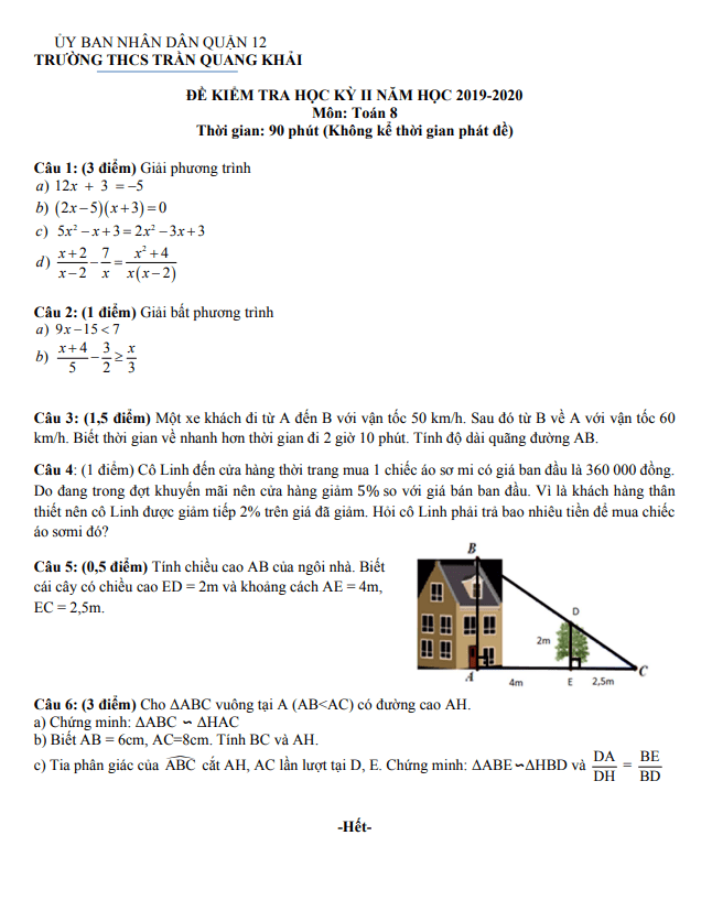 Đề kiểm tra học kỳ 2 Toán 8 năm 2019 – 2020 trường THCS Trần Quang Khải – TP HCM