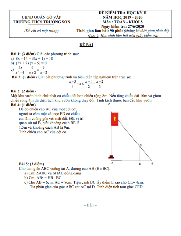 Đề kiểm tra học kỳ 2 Toán 8 năm 2019 – 2020 trường THCS Trường Sơn – TP HCM