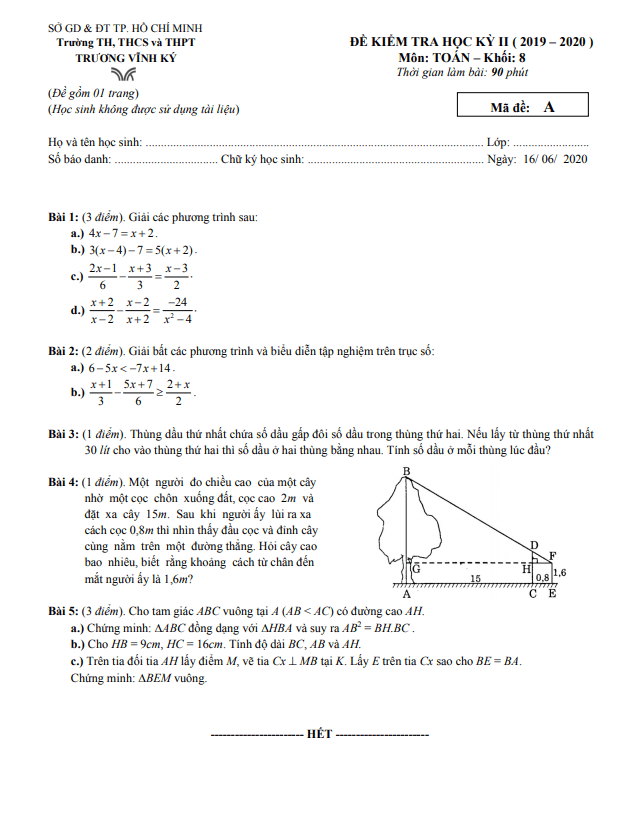 Đề kiểm tra học kỳ 2 Toán 8 năm 2019 – 2020 trường Trương Vĩnh Ký – TP HCM