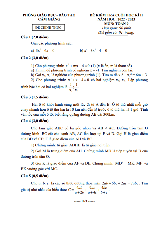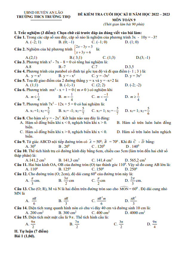 Tổng hợp ĐỀ THI HK2 TOÁN 9 có đáp án và lời giải chi tiết của các trường Trung học Cơ sở, các Phòng Giáo dục và Đào tạo, các Sở Giáo dục và Đào tạo trên toàn quốc (File PDF). Các ĐỀ THI HK2 TOÁN 9 mới nhất sẽ được cập nhật liên tục và nhanh nhất có thể sau khi kỳ thi diễn ra, đáp án và lời giải chi tiết cũng sẽ được TOANMATH.com cập nhật sau đó nhằm giúp bạn đọc thuận tiện trong việc tra cứu và đối chiếu đáp án.