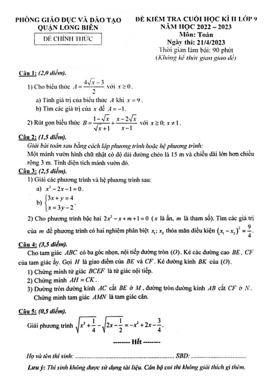 Đề cuối học kì 2 Toán 9 năm 2022 – 2023 phòng GD&ĐT Long Biên – Hà Nội