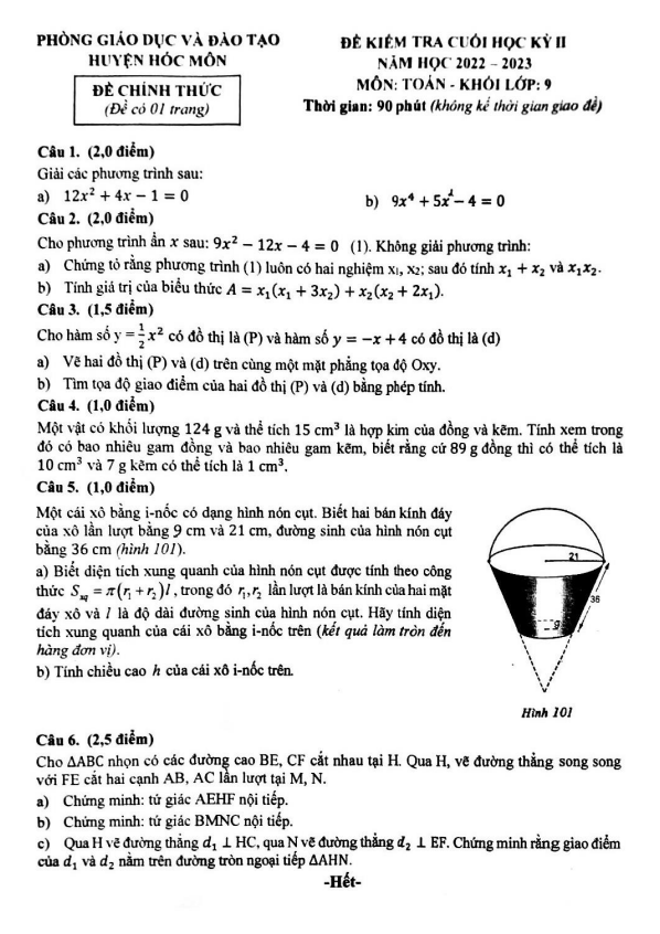Đề cuối học kỳ 2 Toán 9 năm 2022 – 2023 phòng GD&ĐT Hóc Môn – TP HCM