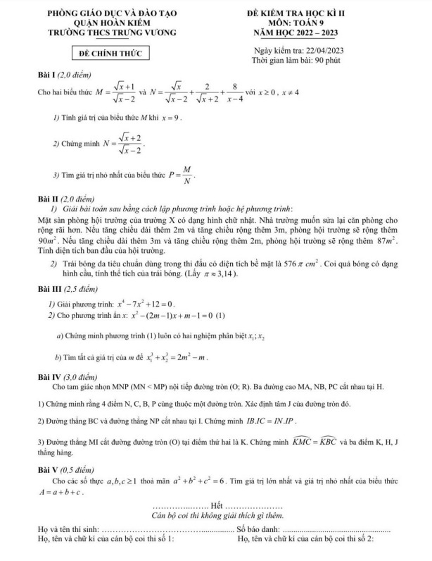 Đề học kì 2 Toán 9 năm 2022 – 2023 trường THCS Trưng Vương – Hà Nội