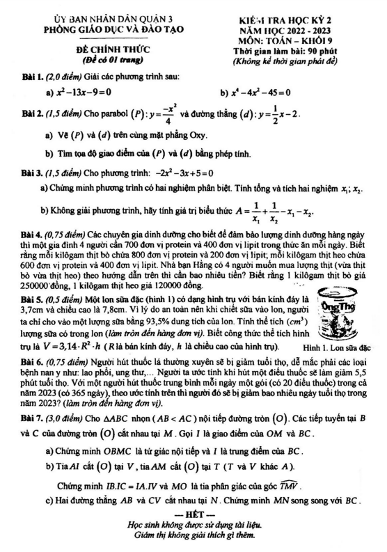 Đề học kỳ 2 Toán 9 năm 2022 – 2023 phòng GD&ĐT quận 3 – TP HCM