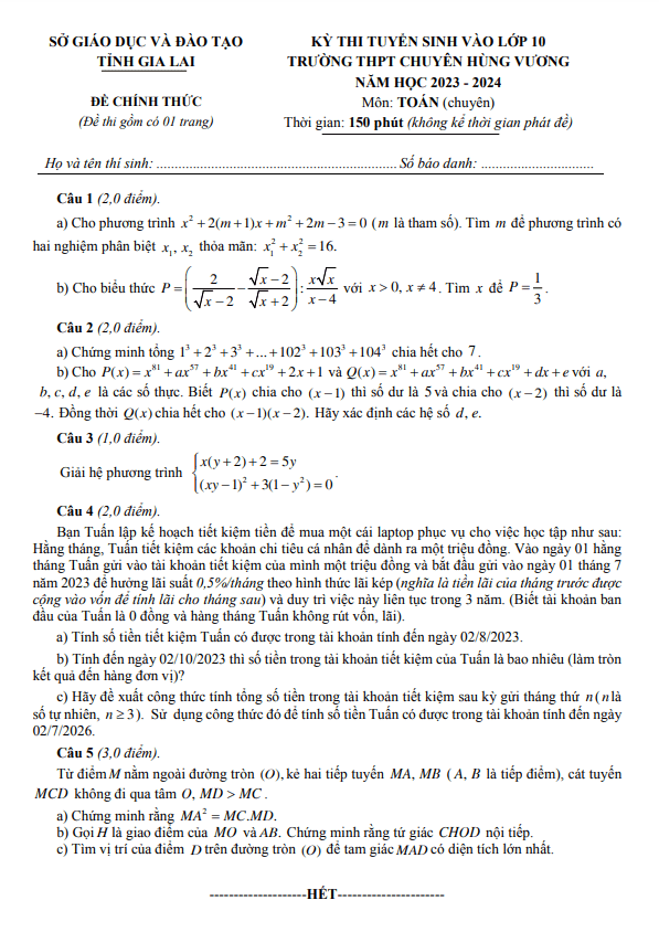 Đề thi vào 10 môn Toán (chuyên) năm 2023 – 2024 trường chuyên Hùng Vương – Gia Lai