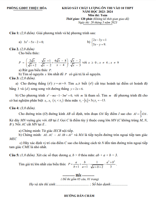 Đề KSCL Toán ôn thi vào 10 năm 2023 – 2024 phòng GD&ĐT Thiệu Hóa – Thanh Hóa