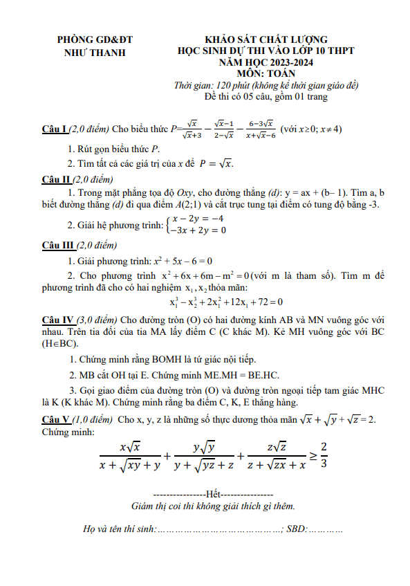Đề KSCL Toán vào lớp 10 năm 2023 – 2024 phòng GD&ĐT Như Thanh – Thanh Hoá