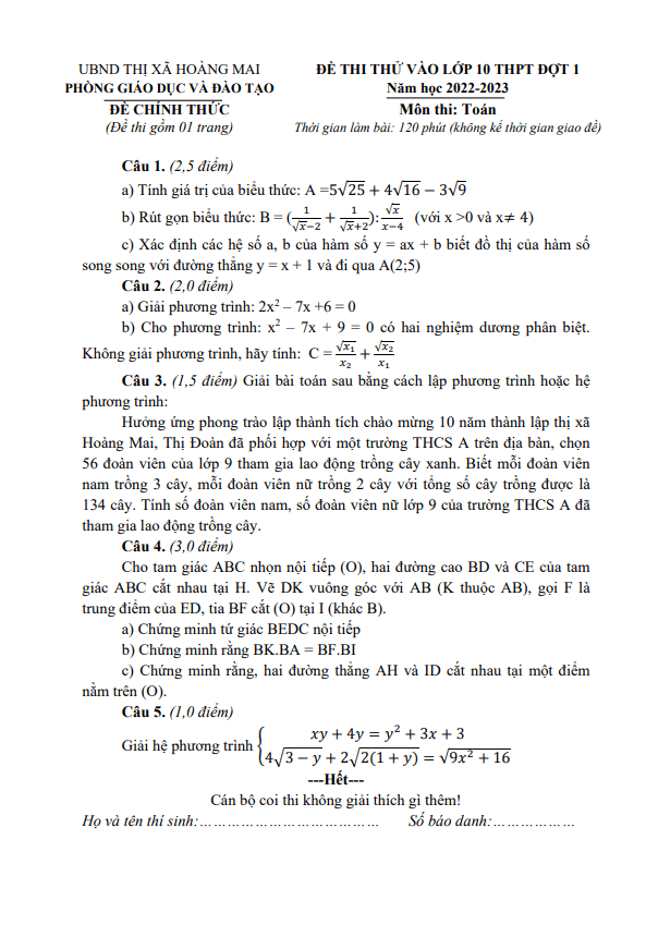 Đề thi thử Toán vào 10 đợt 1 năm 2023 phòng GD&ĐT Hoàng Mai – Nghệ An