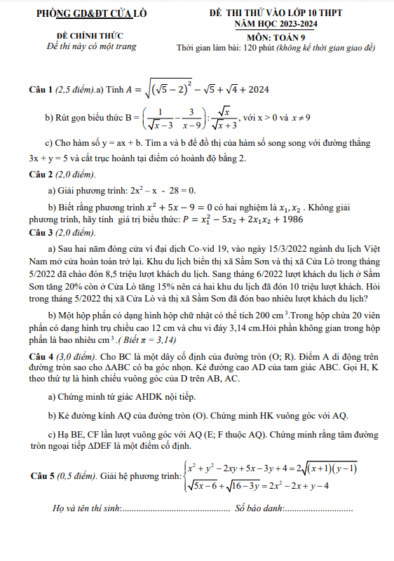 Đề thi thử Toán vào 10 lần 2 năm 2023 – 2024 phòng GD&ĐT Cửa Lò – Nghệ An