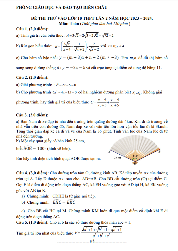 Đề thi thử Toán vào 10 lần 2 năm 2023 – 2024 phòng GD&ĐT Diễn Châu – Nghệ An