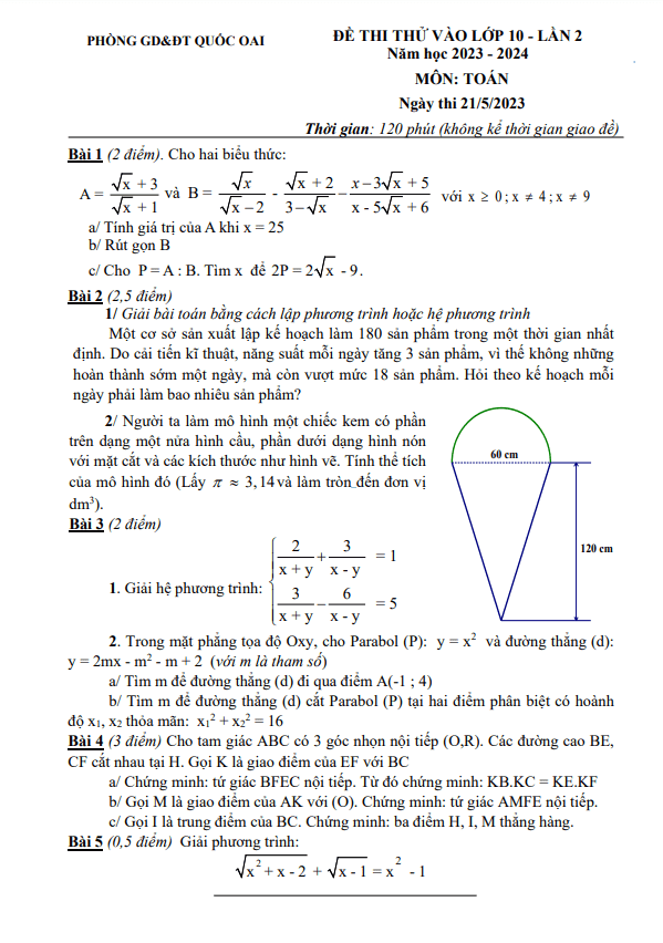 Đề thi thử Toán vào 10 lần 2 năm 2023 – 2024 phòng GD&ĐT Quốc Oai – Hà Nội