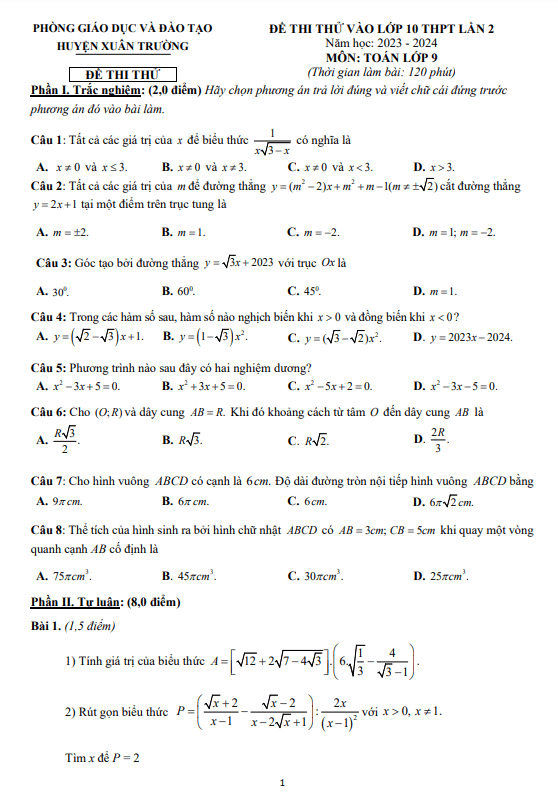 Đề thi thử Toán vào 10 lần 2 năm 2023 – 2024 phòng GD&ĐT Xuân Trường – Nam Định