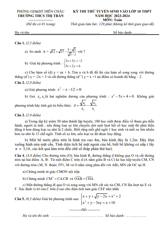 Đề thi thử Toán vào 10 năm 2023 – 2024 trường Thị trấn Diễn Châu – Nghệ An
