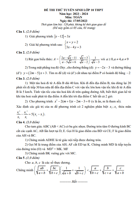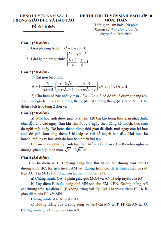 Đề thi thử Toán vào lớp 10 năm 2023 – 2024 phòng GD&ĐT Nam Sách – Hải Dương