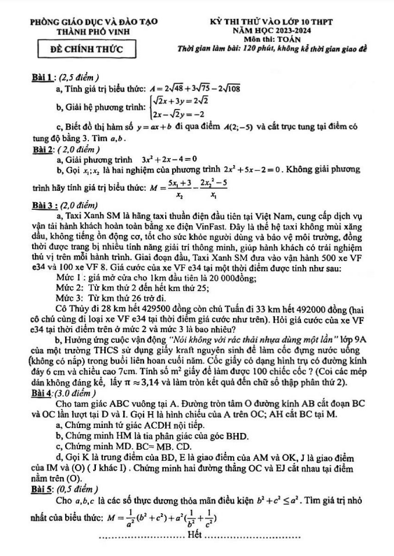 Đề thi thử Toán vào lớp 10 năm 2023 – 2024 phòng GD&ĐT thành phố Vinh – Nghệ An